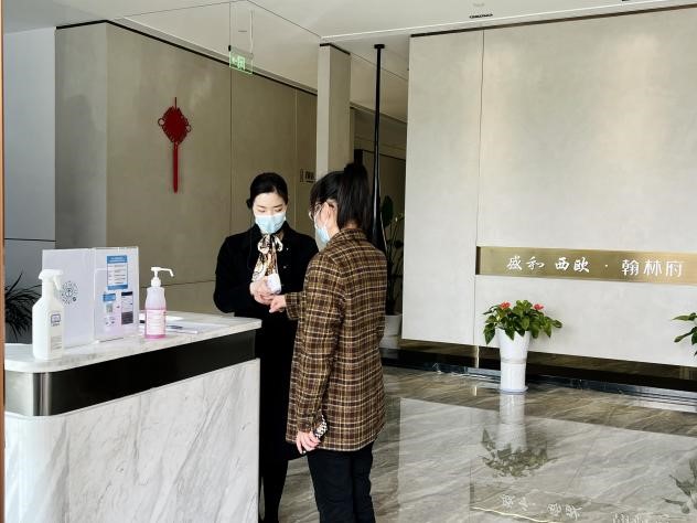 客戶到訪售樓處后,是開展防疫工作的重點階段。翰林府項目嚴格從安全防護的角度出發,嚴苛定制每一項接待流程,讓客戶安心。